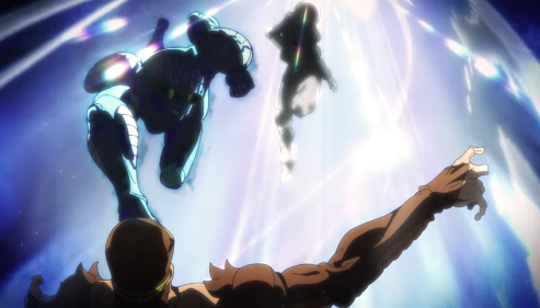 Pucci requests access to recent phone recordings to learn more about Jolyne's call to the Speedwagon Foundation. In the factory room, Jolyne and Weather find themselves in a zero-gravity vacuum being shot at by Lang Rangler's metal projectiles and in danger of suffocating from a lack of oxygen with their blood leaking from their bodies. Weather uses his Stand and the remaining air to create suits of clouds that allow them to breathe and halt their blood loss for a short time. Jolyne figures out that Jumpin' Jack Flash has a limited range in the room and tries to help Weather reach it so he can manipulate the air, but his suit suffers considerable damage from Rangler's attacks. Rangler attempts to rupture her protective suit, but Jolyne attaches multiple threads to his projectiles, allowing her to pull him into the zero-gravity vacuum area which causes his blood to boil. He destroys Jolyne's suit by throwing an exploding glass bottle at her, but Weather saves her by giving her the rest of his cloud suit. Rangler is forced to reinstate gravity, but the incoming burst of air pushes him towards Jolyne, allowing her to pummel him with Stone Free. She uses Rangler's card to request a guard to open the door, but she is greeted by Pucci.[1]