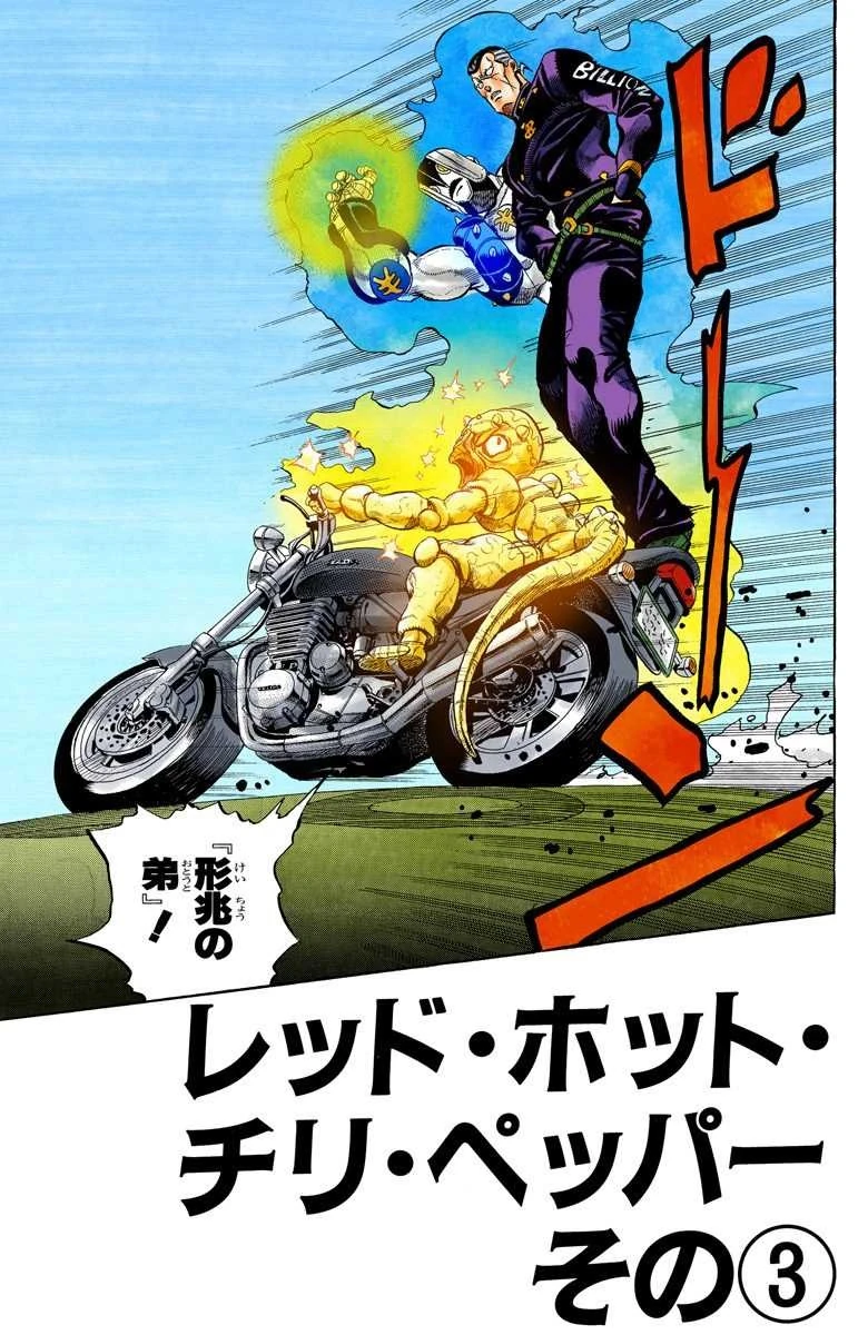 On the motorcycle, The Hand swings toward Red Hot Chili Pepper, which easily evades being erased. It temporarily gloats about being too fast for Okuyasu, but the latter reveals that he's been aiming for the motorcycle all along. The motorcycle is now destroyed and Red Hot Chili Pepper finds itself far from any power source, unable to escape. Josuke and Koichi have observed everything from far away, and are awed by Okuyasu's quick thinking, but Jotaro warns them that the enemy is still dangerous.