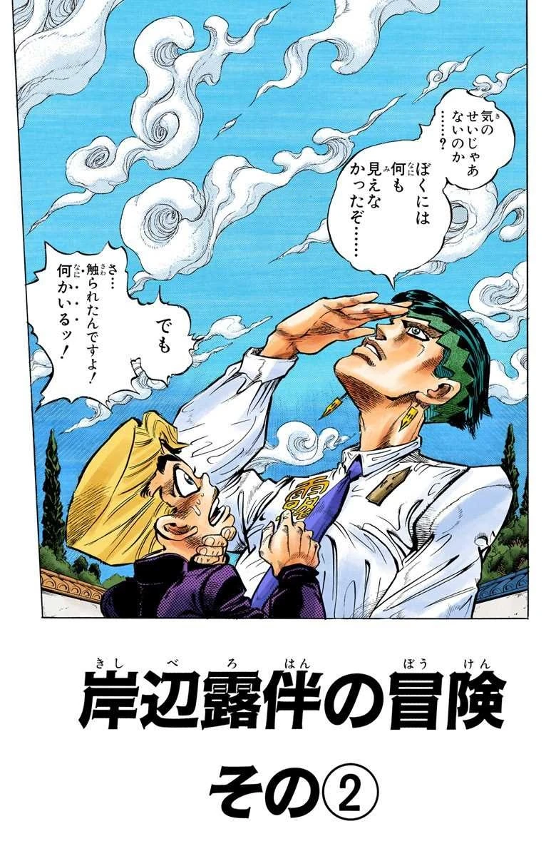 Rohan and Koichi find themselves stuck in a mysterious street. Rohan asks Koichi to send his Echoes up in the sky again. But he is interrupted when a young woman presents herself before them. She proposes to guide them, but Rohan attacks by drawing artwork in the air, subjecting the girl to Heaven's Door's power. Rohan investigates the girl, who is named Reimi Sugimoto, a 16 years old girl without a Stand who lives in Morioh. After Rohan begins to uncover more personal information and Koichi interrupts him, the mangaka erases Reimi's recent memories and resumes the conversation. Reimi, acting as a guide for Rohan and Koichi in the streets, tries to be friendly by making a "pocky horoscope" with Rohan, predicting that he'll get dumped by a girl due to his personality, which Rohan dismisses.