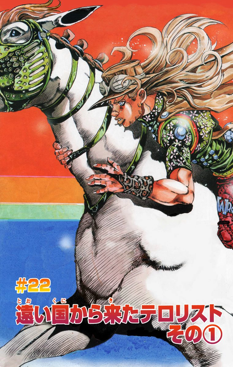 The Terrorist from a Faraway Country, Part 1 (遠い国から来たテロリスト その① Tōi Kuni kara Kita Terorisuto Sono 1), originally Bombing in the Desert (砂漠の猛爆 Sabaku no Mō Baku) in the WSJ release, is the twenty-second chapter of Steel Ball Run and the seven hundred seventy-fourth chapter of the JoJo's Bizarre Adventure manga.