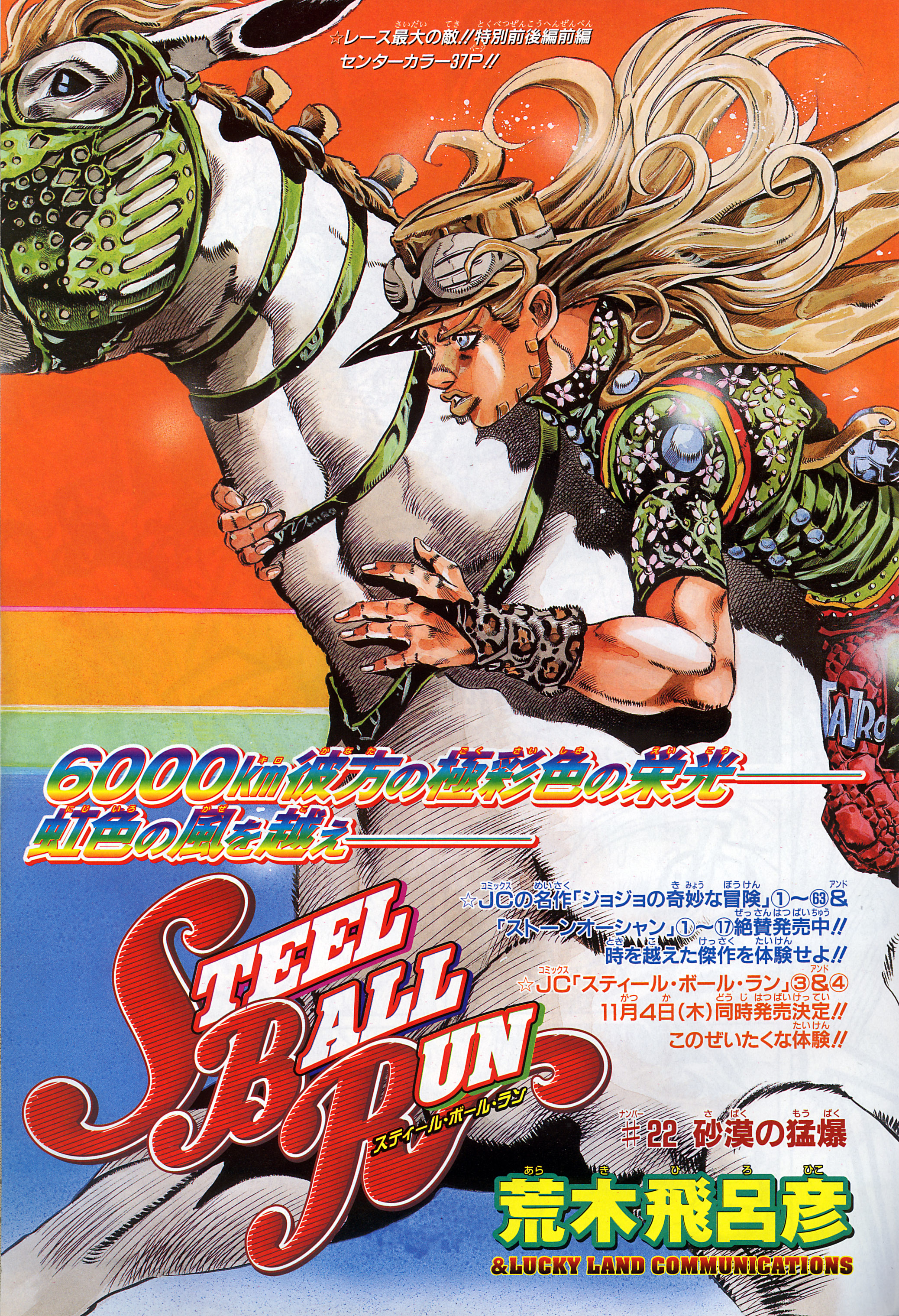 Oyecomova departs from the town, but Gyro, decides to release his grip, using the Steel Ball to reduce the damage done to him and preserve his throwing arm at the cost of an injured leg as well as attack Oyecomova who flees. Gyro realizing that Oyecomova is after the Zombie Horse, which has a healing power, and tells Johnny that they'll pursue Oyecomova.