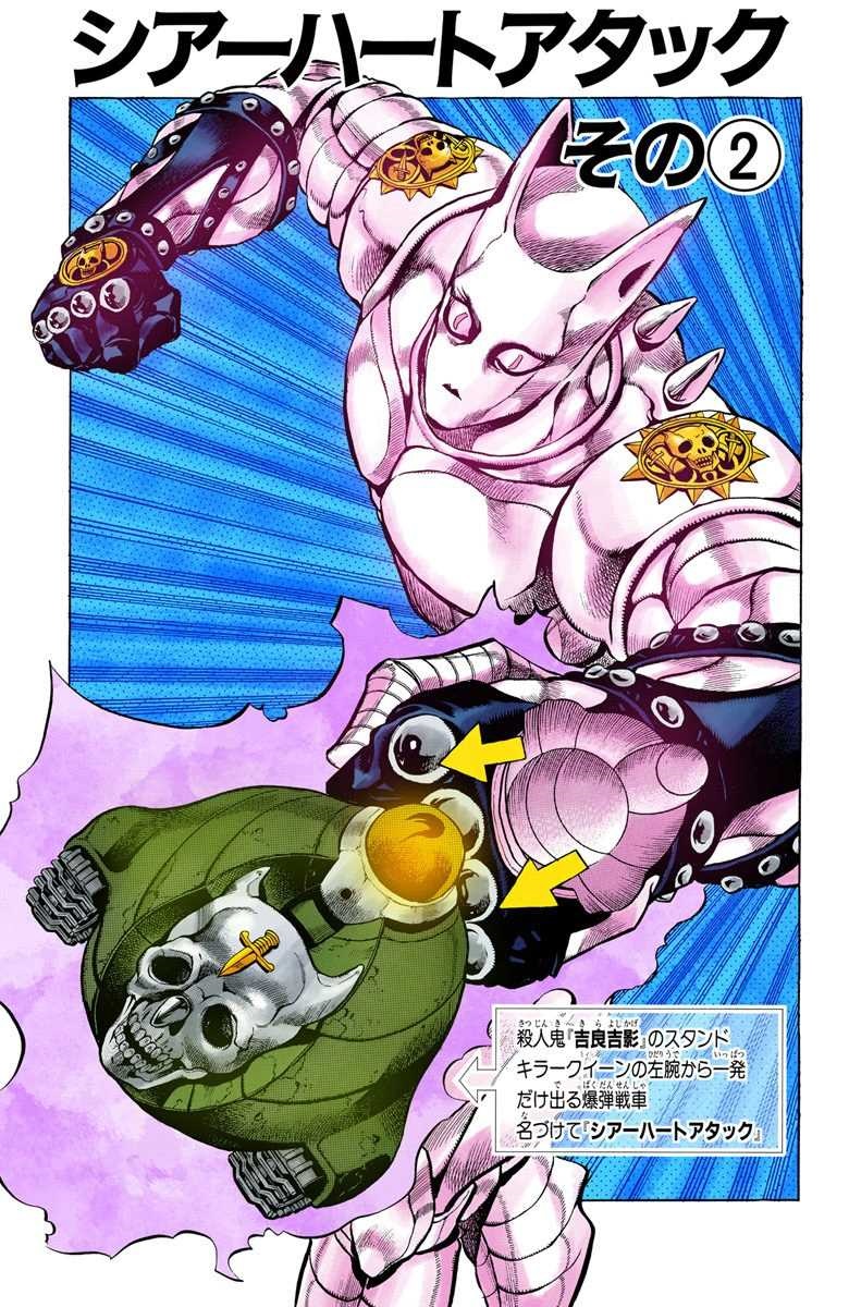 Koichi tries to dash toward the killer but is stopped by Jotaro, who warns him about possible traps. Sheer Heart Attack effectively explodes, narrowly wounding both Jotaro and Koichi and disintegrating the shop owner. Moreover, Koichi hears a door shutting, meaning that the killer escaped, and wants to chase him, but Jotaro advises to ponder their move, being certain that Sheer Heart Attack is still present. Koichi is skeptical, and lets his guard down, letting the substand take him by surprise. It jumps on Koichi's head and begins to roll on him, hurting him with its threads. Jotaro summons Star Platinum who heavily pummels Sheer Heart Attack, but it surprisingly remains unscathed. Koichi warns Jotaro that touching it may trigger an explosion, thus Jotaro stops time and pummels it even more heavily and punches it into the ground. Unfortunately, Sheer Heart Attack leaps out of its hole and goes to attack again, being invulnerable to Star Platinum's might.