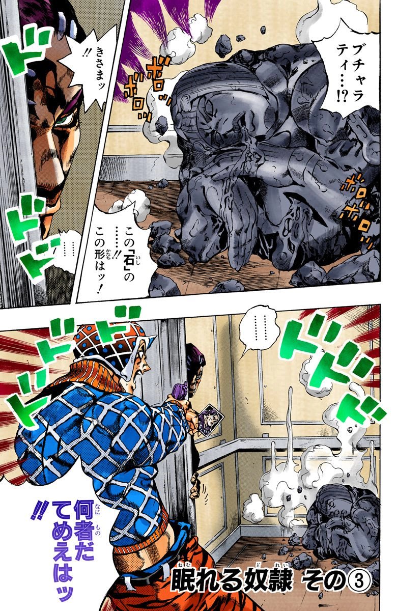Mista goes into the elevator, holding Scolippi at gunpoint and interrogating him about the murder, but the stone disappears again. Scolippi explains that his Stand, Rolling Stones, takes the shape of the fate of a chosen target, this time Bucciarati.