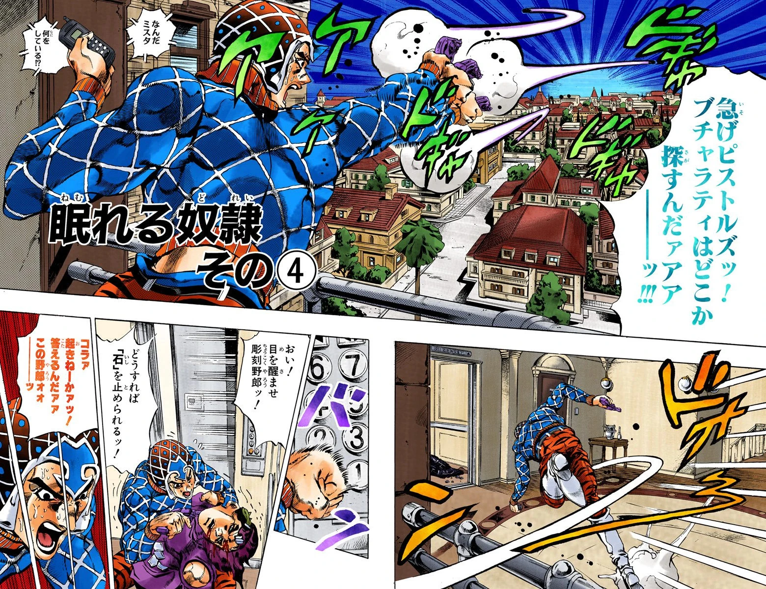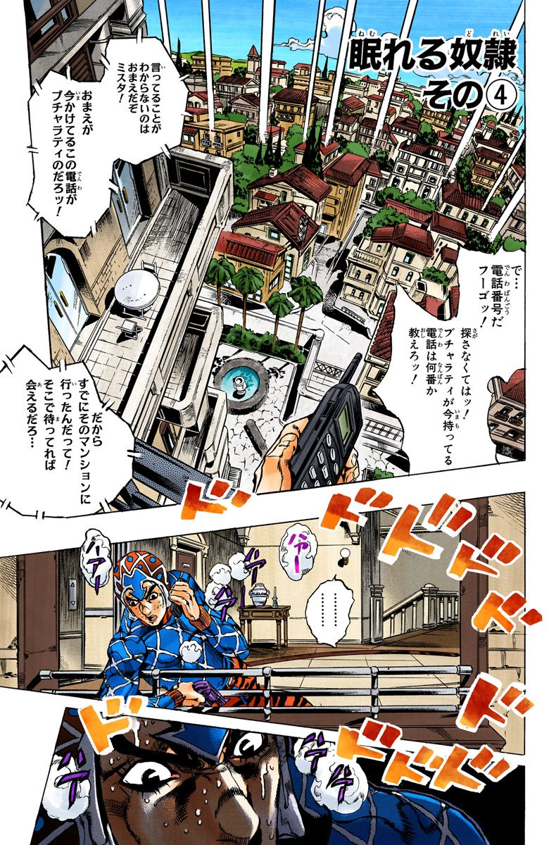 Sleeping Slaves, Part 4 (眠れる奴隷 その④ Nemureru Dorei Sono 4), originally Don't Touch It! (触っちゃダメ! Sawatcha Dame!) in the WSJ release, is the one hundred fifty-fourth chapter of Vento Aureo and the five hundred ninety-third chapter of the JoJo's Bizarre Adventure manga.