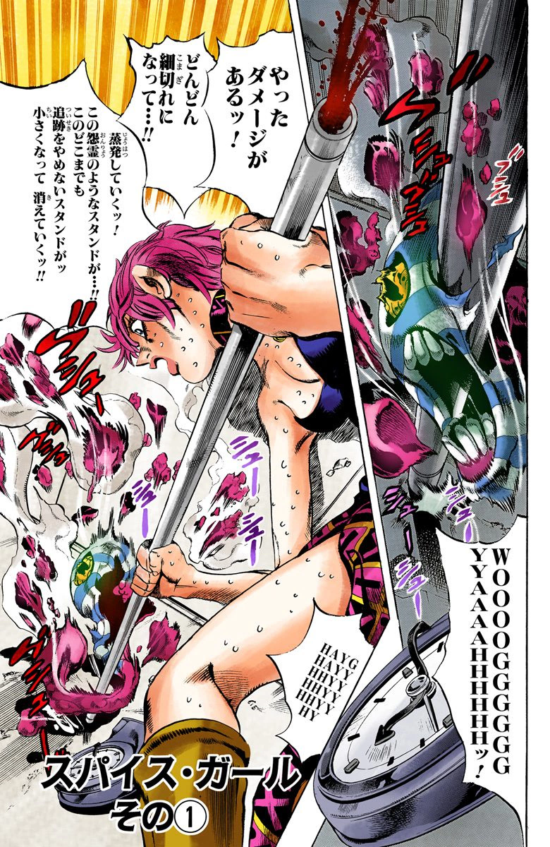 Spice Girl, Part 1 (スパイス・ガール その① Supaisu Gāru Sono 1), originally Bastard (くそ野郎 Kuso Yarō) in the WSJ release, is the one hundredth chapter of Vento Aureo and the five hundred thirty-ninth chapter of the JoJo's Bizarre Adventure manga.