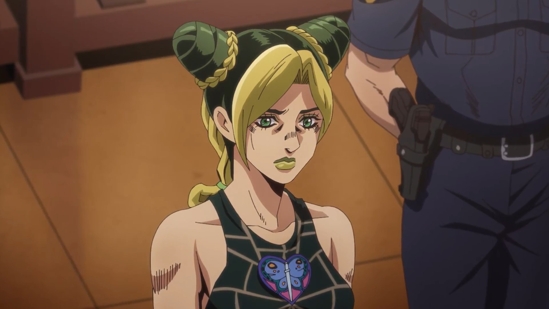 The guard tells Jolyne to get off the bus, but she can hear sounds of Ermes being molested by corrupt cops in their attempt to get her money. Jolyne subconsciously tears the guard's ear off, and Ermes is left alone.