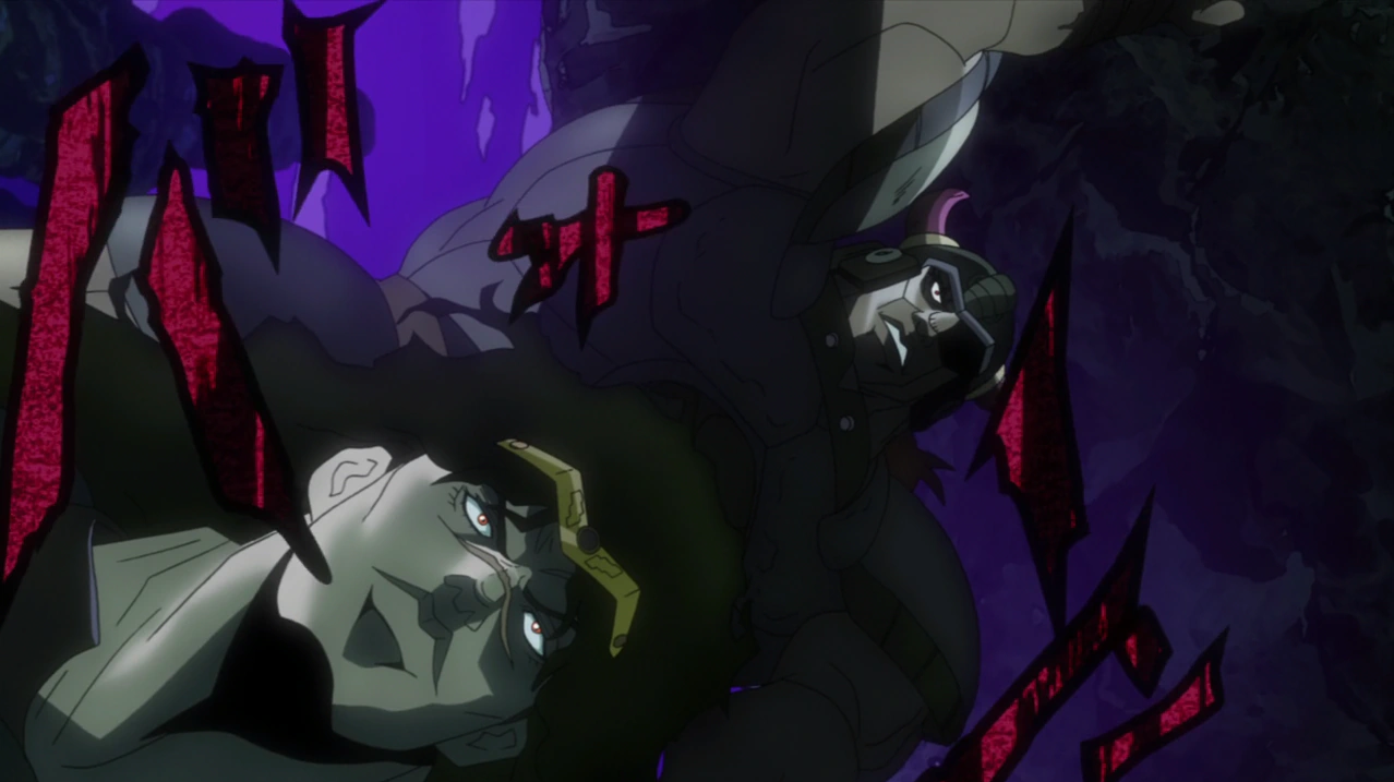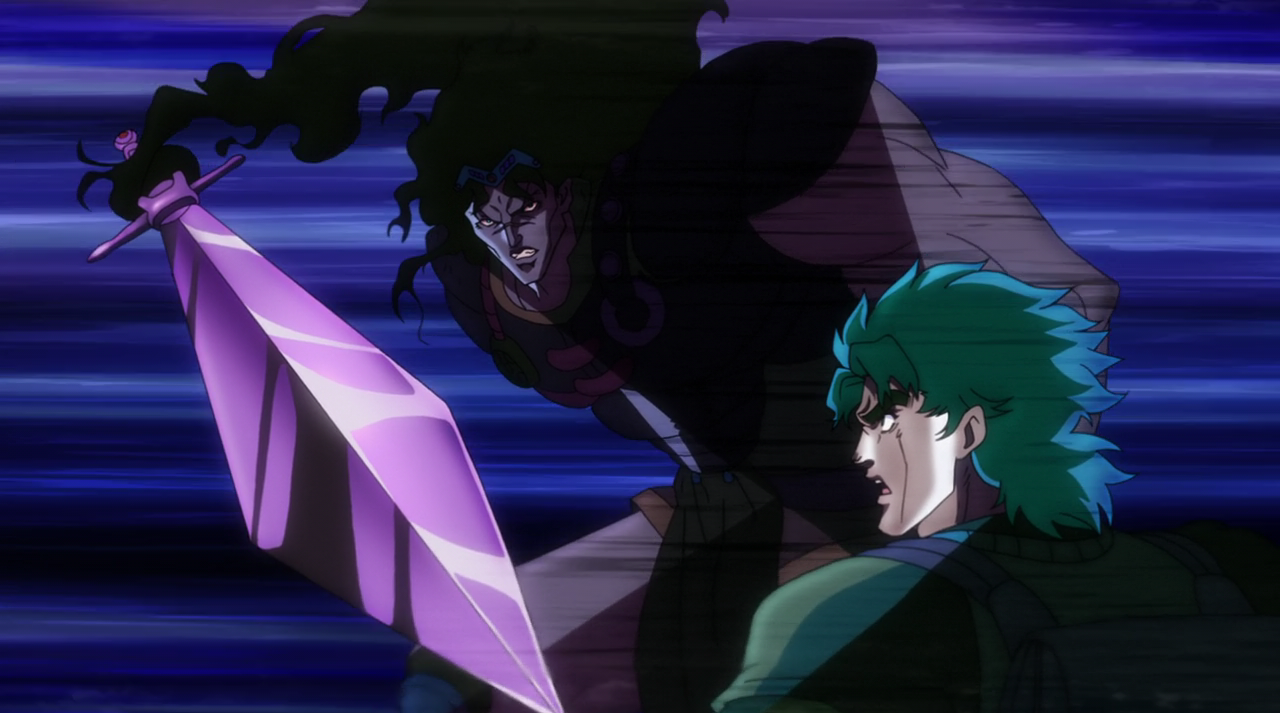 Jonathan,Zeppeli and Dio maintain contact with their fists. However, when both Ripple users try to send an attack through Dio's arm, the latter freezes both of their bloodstreams. Jonathan's hand begins to suffer from chilblains, prompting Zeppeli to kick Dio in order to save his pupil. Unfortunately, Dio breaks Zeppeli's leg with his fingers and throws both humans down to Speedwagon again. Jonathan and Zeppeli contemplate their powerlessness against Dio's technique as the vampire gloats.