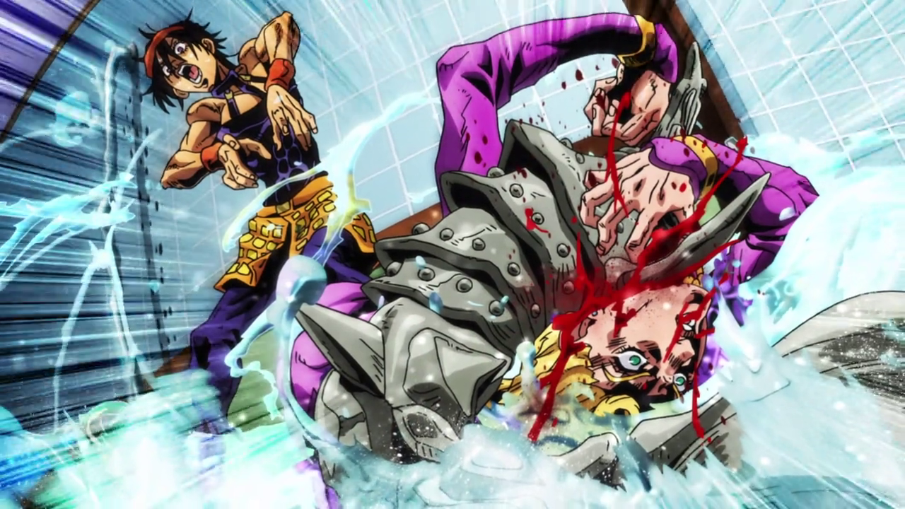 Giorno finally understands that Narancia is being forced to lie by an enemy ability to Narancia's relief. However, water starts leaking from the damaged pipe, creating a large puddle from which Clash emerges and tears at Giorno's throat.