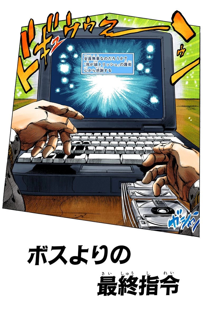 The Boss' Last Orders (ボスよりの最終指令 Bosu yori no Saishū Shirei), originally Meeting Point! (ミーティング・ポイント! Mītingu Pointo!) in the WSJ release, is the seventy-seventh chapter of Vento Aureo and the five hundred sixteenth chapter of the JoJo's Bizarre Adventure manga.