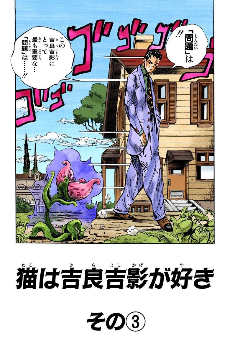 Shinobu appears behind him and asks if it's where Kira buried the cat. She dislikes the spot because it's where she lost her toenail. Kira notices the cat-plant reacting to Shinobu and realizes it attacked her because it held a grudge. His worries increase as Shinobu walks closer to him, asking him to bury the cat somewhere else. He is not worried that she will be attacked again, but worried for his own sake because if she sees the creature moving, she would surely talk about it which could bring Jotaro to investigate the rumor. As the cat-plant is about to attack again, Kira decides he has no choice but to erase it with Killer Queen.
