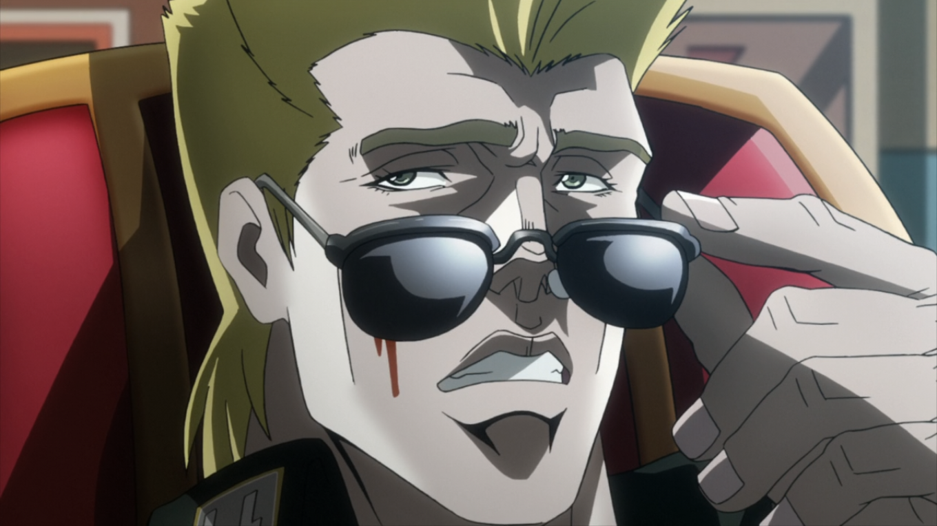 Meanwhile, it is revealed Speedwagon is alive and being held captive in Mexico, where a German military officer named Rudol von Stroheim interrogates him about the Pillar Man, which they have excavated from the cave and intend to revive. Holding a group of Mexicans prisoner, Stroheim arranges a blood feeding to the Pillar Man. In the panic, a boy volunteers, and the major orders the other prisoners to be executed. Meanwhile, Joseph also makes his way to Mexico, unaware that he is being followed by a strange assassin.