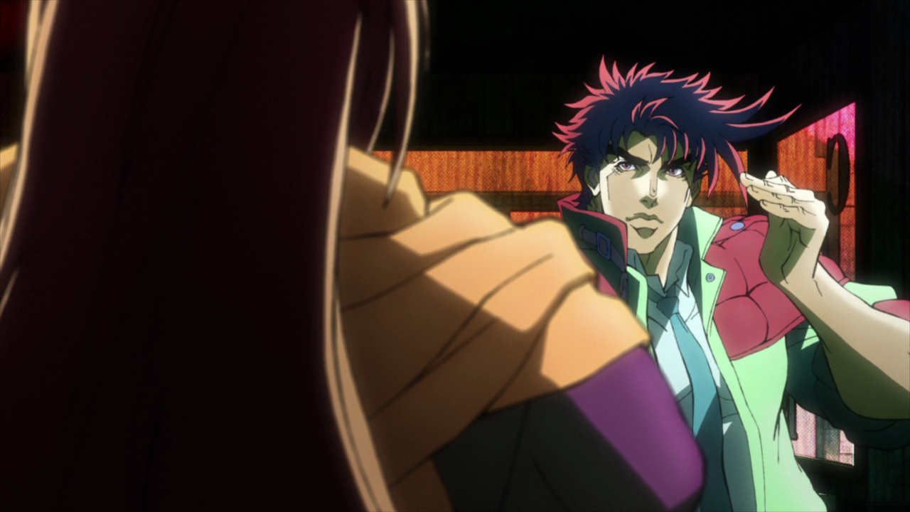 In Battle Tendency, choosing how to position the camera went more naturally. There are also more background layers, and a lot of nervous stuff on the screen. The line between ultra-stylized and normally colorized scenes is also more noticeable; you go from one scene to the other in one go. The fight against Straizo is gorier than in the manga, which implies a lot of blackened frames during the TV broadcast. For the Bluray and DVD versions, we could allow all the necessary details. Note the 3D model for the Sathiphorosia scarabs; they say it's a great selling point. (laugh). Personally, I like the scene where Straizo explodes into a thousand pieces. I find it well produced; we owe it to the episode's director and storyboard manager: Mitsuhiro Yoneda. Everyone was saying "We don't need Bruto-chan" and it was true. It is with a heavy heart that we cut his appearance. It was the only scene that wasn't relevant to the main plot, and we had to make place somewhere... Visually speaking, there is a good contrast between New-York in the first half and Mexico in the second one. You really get the feeling of the dry climate. |