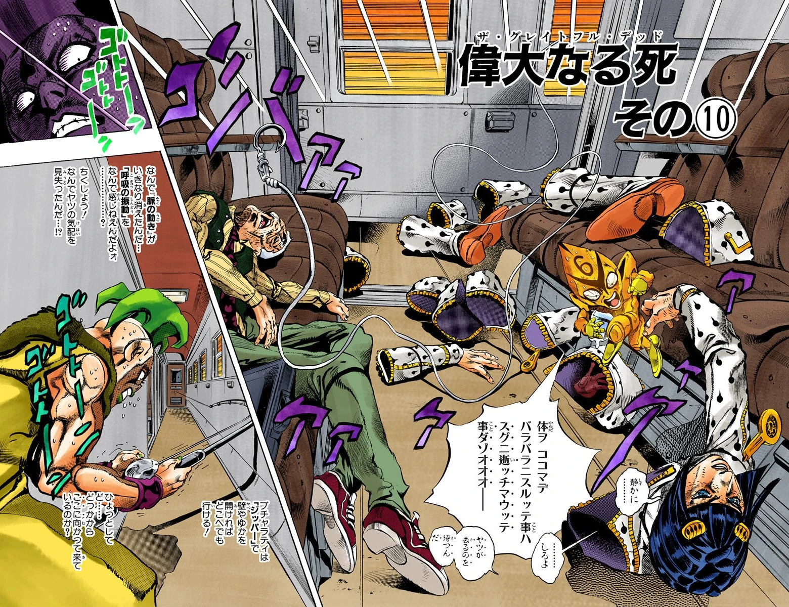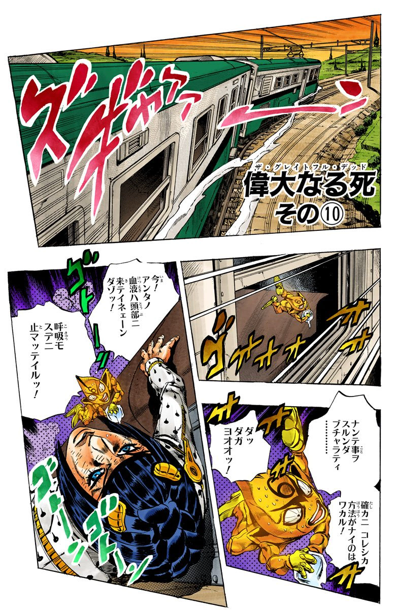 Bucciarati uses Sticky Fingers to split his heart in two, allowing him to stay under Pesci's radar. Pesci, upset, retrieves his hook, and tries searching for Bucciarati in other areas of the train. Bucciarati tries to retrieve the pieces of his body, but can't reach them. Realizing his fate, Bucciarati gives up and prepares to die.