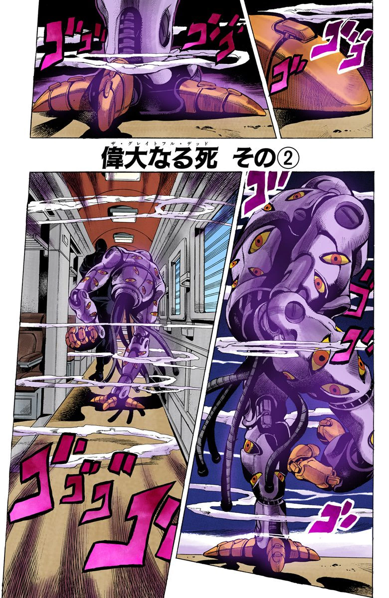 As Narancia and Giorno start rapidly aging, Mista begins to panic. Bucciarati orders him to calm down, saying that the enemy couldn't have found them yet. Bucciarati gives Mista two options, either escape the train with Trish, or kill the Stand user. Mista picks the latter option, believing it would be simpler. As they watch Narancia beginning to deteriorate, Mista starts to exit the turtle, but is stopped by Giorno. Giorno states that they must learn how the Stand works. The enemies can't kill Trish, so there must be a way to differentiate between male and female.