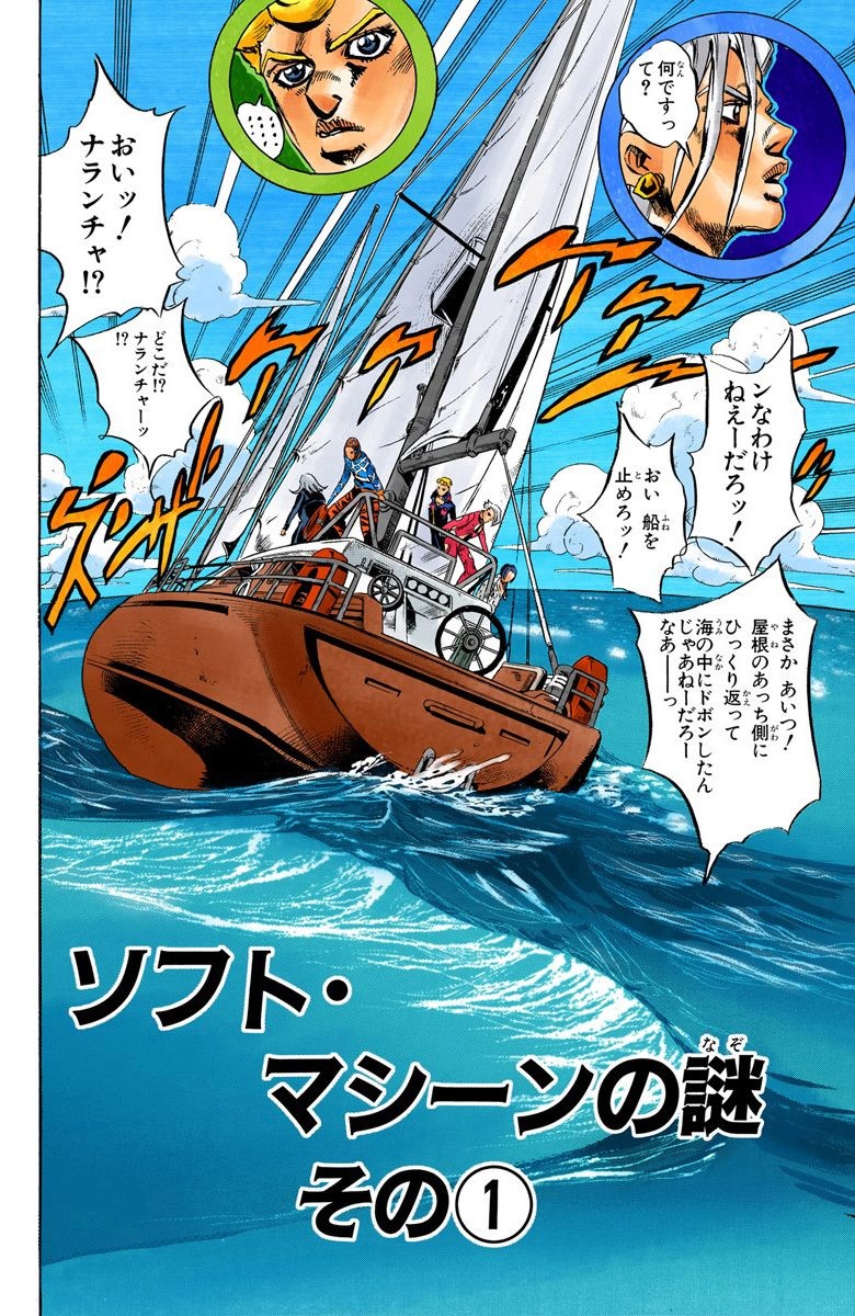The Mystery Behind Soft Machine, Part 1 (ソフト・マシーンの謎 その① Sofuto Mashīn no Nazo Sono 1), originally You! (おまえなら! Omae Nara!) in the WSJ release, is the nineteenth chapter of Vento Aureo and the four hundred fifty-eighth chapter of the JoJo's Bizarre Adventure manga.