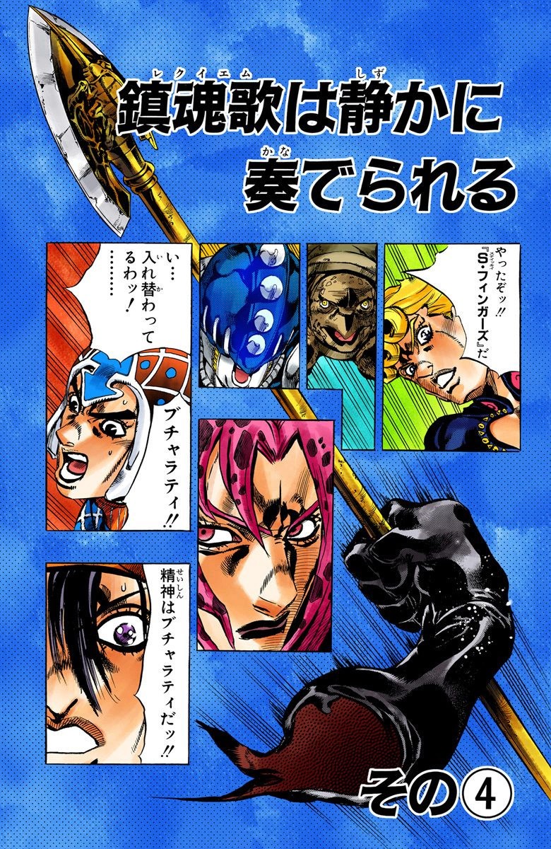 Sex Pistols No.1 goes momentarily berserk, redirecting one bullet back at Mista, but is saved by Spice Girl softening it right before it hits his face. The party realizes that Silver Chariot's manipulation of souls extends to that of Stands, and the Sex Pistols who watched over Bucciarati's body warn everyone that he has woken up.