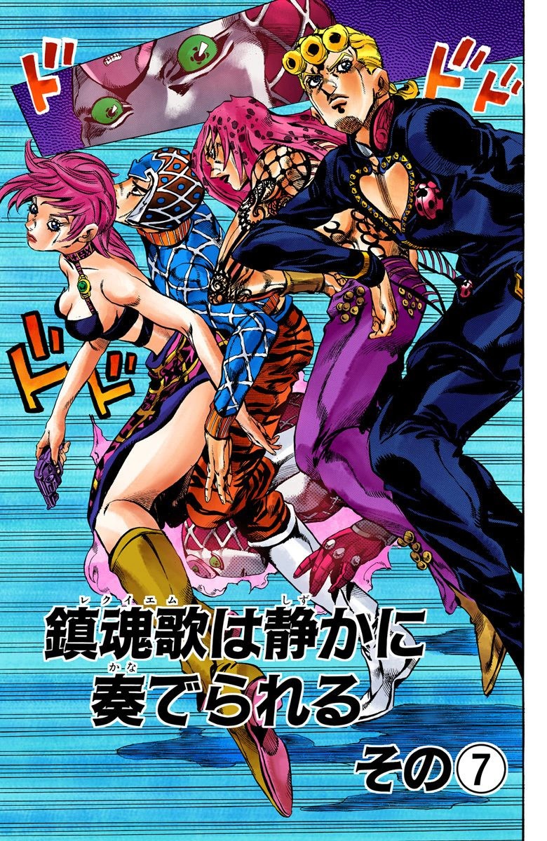 Giorno tries to pick up the Arrow Chariot Requiem dropped, but Gold Experience begins to emerge from him. He instead tries to drop a pebble toward the Arrow, only for Mista to catch another pebble birds dropped on Giorno's head. They understand that Silver Chariot's defense is proportionate to the attack. When Polnareff who is without a Stand picks up the Arrow, Chariot Requiem suddenly rushes toward him, and when Mista tries to defend Polnareff, he realizes that his revolver is broken.