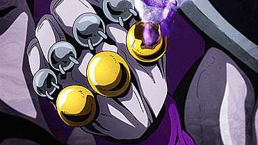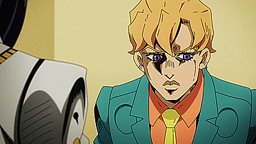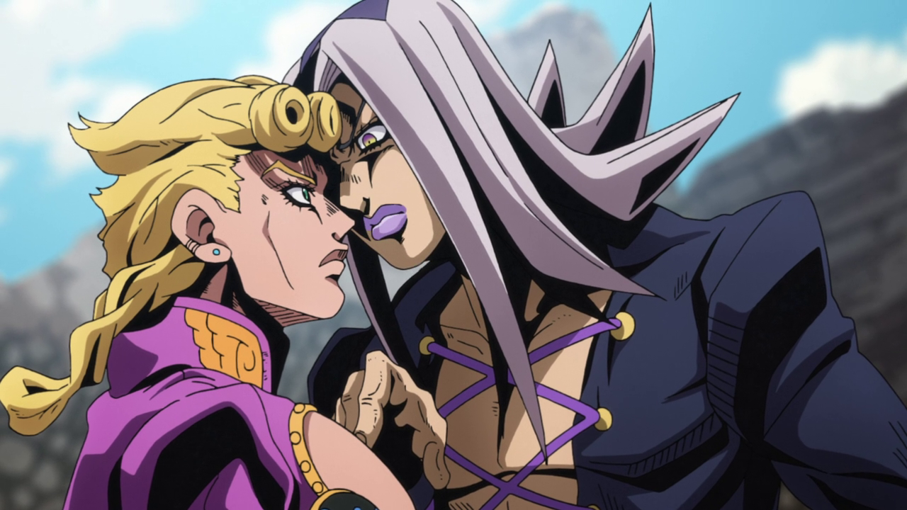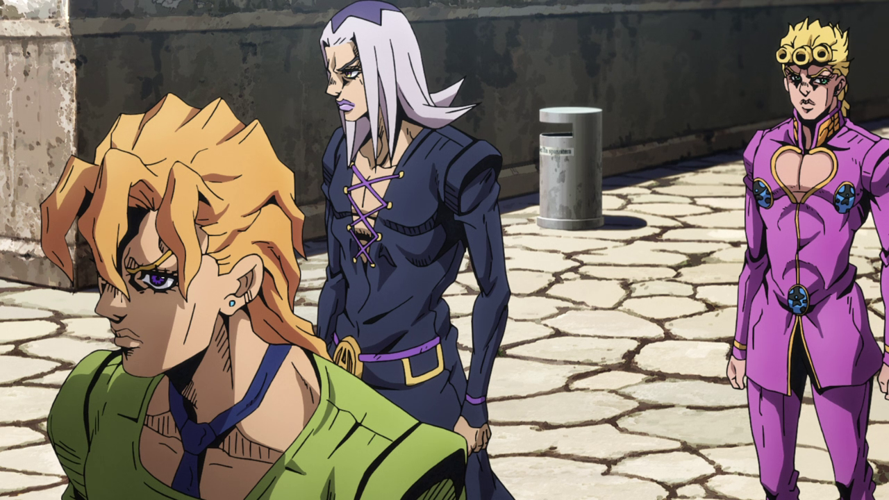 - After Abbacchio grabs Giorno's arm to pull him away from Purple Haze, Giorno is shown pushing Abbacchio's arm away.