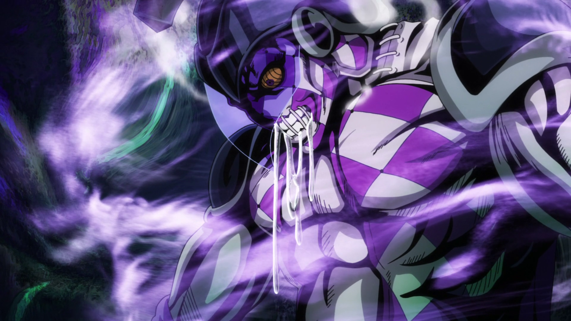 In front of Purple Haze, Abbacchio becomes uncharacteristically nervous and as the Stand goes berserk and punches a nearby wall, Abbacchio flees without second thoughts. In the mirror world, it is revealed that Fugo punched the wall on purpose to propel the debris toward Illuso, but Man in the Mirror easily deflects them toward Fugo. Suddenly, Illuso sees a dead crow falling in front of him, followed by a whole murder of crows somehow rapidly decomposing into nothing. Abbacchio finally explains that Purple Haze's ability is to release a deadly flesh-eating virus from the bulbs on its fists, although the virus is destroyed by light, limiting its range. By punching the wall, one of the bulbs cracked, releasing the virus into the air. Although Abbacchio states that Purple Haze mostly embodies Fugo's violent side, the Stand demonstrates a small quirk of personality when it humorously tries to swipe its own drool off it.