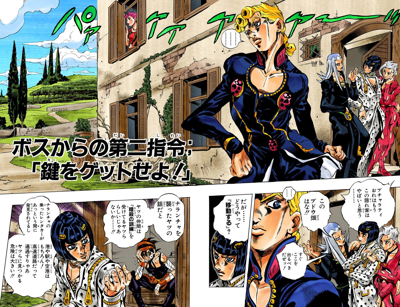 At the grape farm in which they're hiding, Team Bucciarati debates over their next action. Abbacchio states that they should leave immediately, but Bucciarati is against this, saying that rash actions will get them killed. Fugo agrees with Abbacchio, believing this all to be Narancia's fault. Giorno defends Narancia, and agreeing with Bucciarati, says that they should wait for the boss' orders.