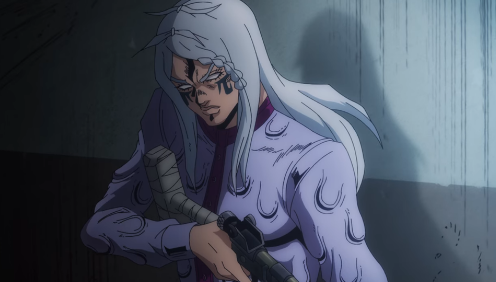Elsewhere, in the men's ward, Johngalli A. is sitting peacefully as the guards pass him by. As soon as they're gone, Johngalli reassembles his rifle, which he had concealed as a cane, and proceeds to speak to himself about the principles of sniping, and further begins to speak of how wind can be unpredictable, but still read. He demonstrates his point by likening the wind to a fly which appears to move randomly, but can still be predicted. He drops a shell and crushes a fly with it. He then locates Jolyne and Jotaro and grows angrier and desires revenge against them and their entire bloodline for killing DIO.