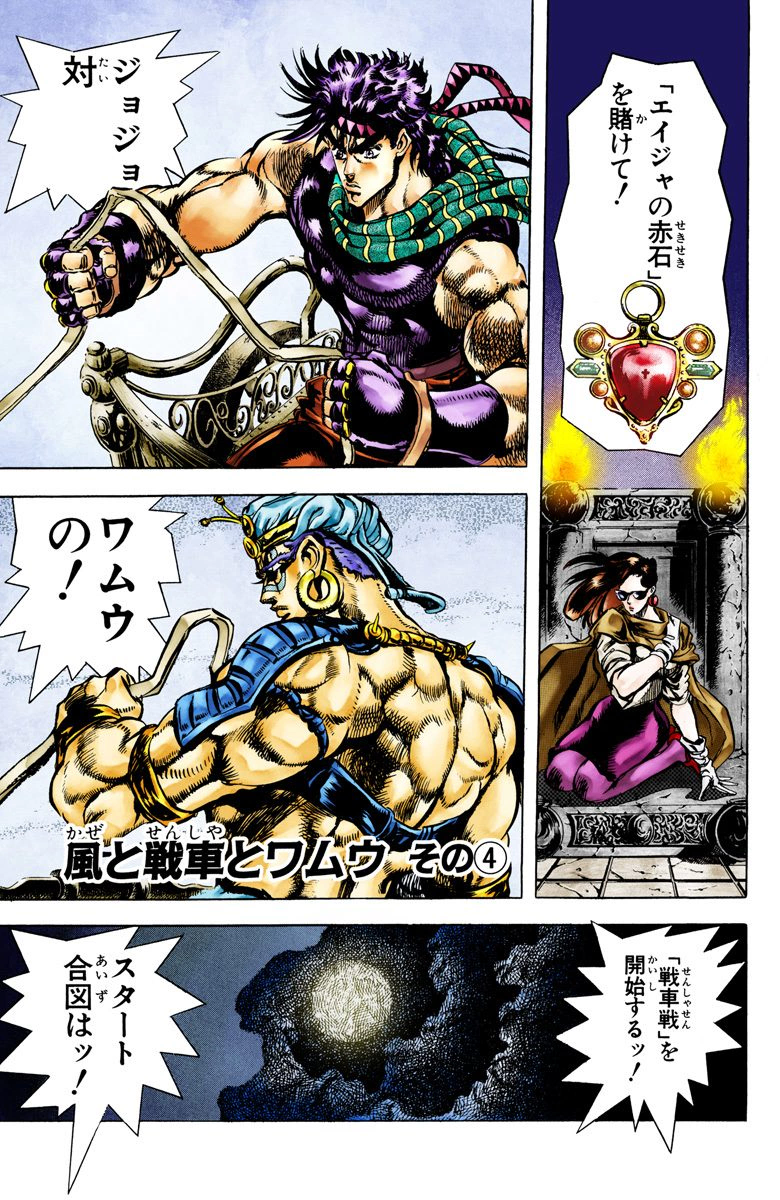 Moments before the race's beginning, while everyone looked to the moon, Joseph scattered rubble under Wamuu's chariot wheel, causing it to stutter when the race starts. JoJo, being in the lead, passes the first lap and grabs the war hammer. With this JoJo believes he has the upper hand but doesn't realize Wamuu is plotting something.