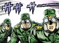 After Caesar flamboyantly sits down at a table, he and Joseph start up a game of poker. Both end up cheating and start to argue aimlessly until Speedwagon interrupts to ask why they've been waiting around for 8 hours. A moment later, a car arrives to take them to the other Pillar Men. Caesar explains that he had formed an alliance with the Nazis due to their common interest in the Ripple and in finding a way to defeat the Pillar Men. He introduces the driver as a young German soldier named Mark, who is betrothed to his girlfriend and planning to marry in the following week.