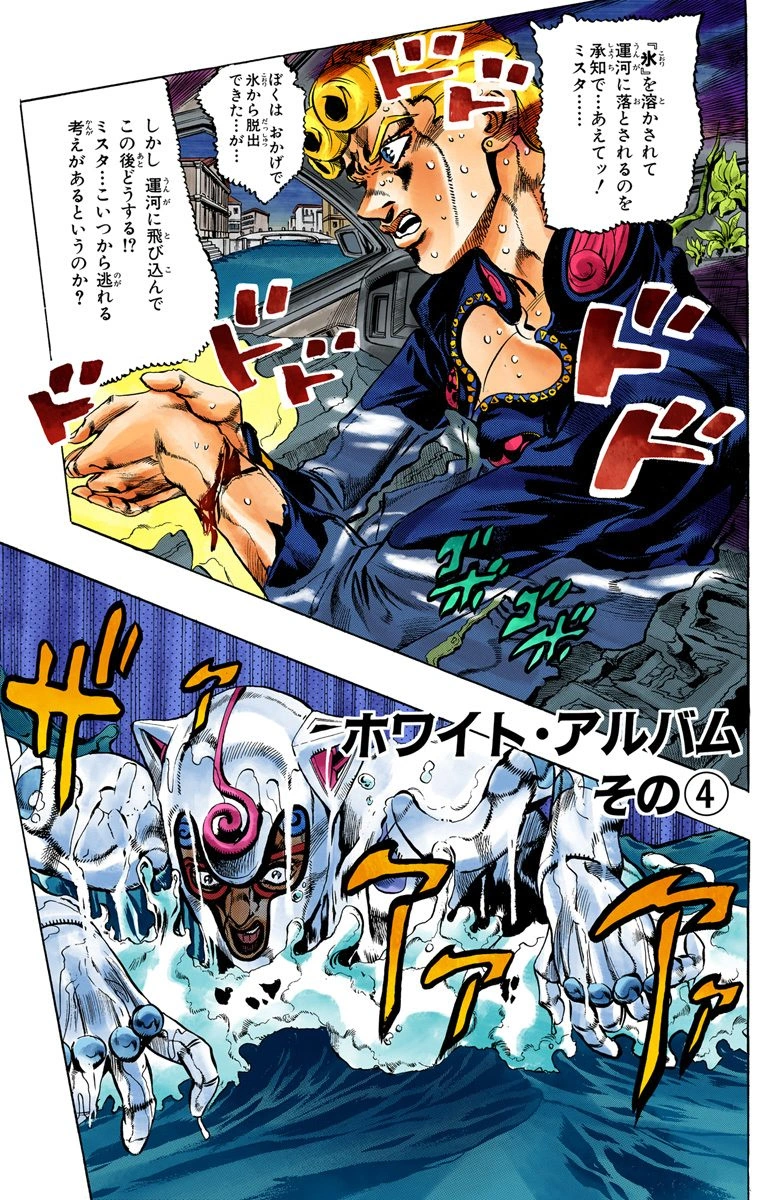 Ghiaccio swims toward Mista, surrounding him with ice. Giorno tells Mista to flee, but the gunslinger spots bubbles around Ghiaccio's neck and concludes that the armor must have an airhole somewhere. He shoots at Ghiaccio's neck, but it is protected. As Mista is almost overwhelmed by the ice, Giorno yells at Mista to shoot the herbs floating on the water.