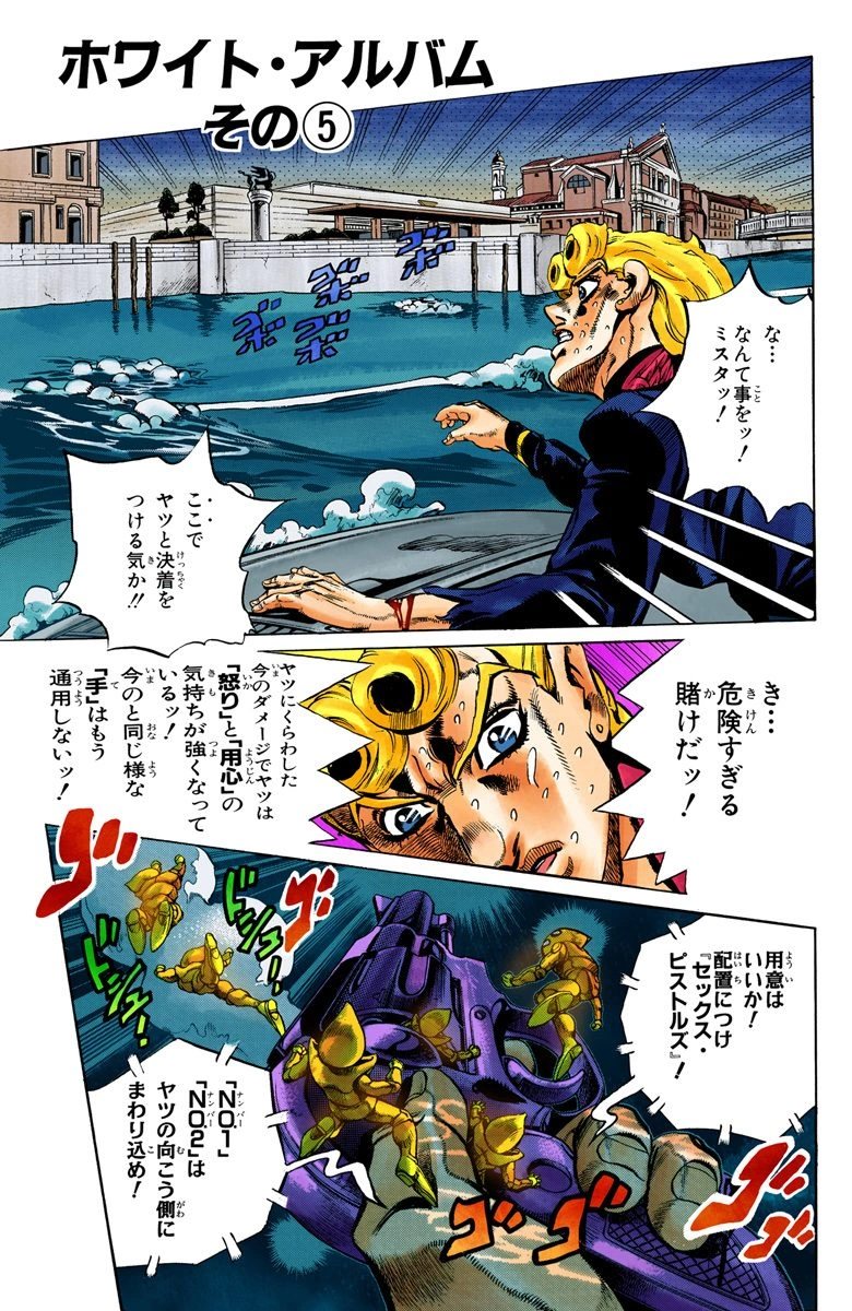 As Ghiaccio swims back to the surface, Mista plans to shoot in in the nape as he resurfaces. Sex Pistols reveal that White Album's helmet blocks the airhole, which Mista alleviates by distracting Ghiaccio when he shoots a fish, making the assassin turn his head and freeing the way to the airhole.